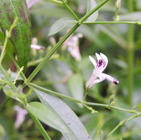 Description: Erect annual herb, 0.4-1m. high. Stems quadrangular, much-branched. Leaves opposite, short-petioled, oblong-attenuate at both ends, glabrous, pale beneath. Inflorescence in few-flowered axillary and terminal raceme or panicle; flowers white with pink spots. Capsule linear-oblong, acute at both ends, pubescent. Seeds numerous, oblong, glabrous.
