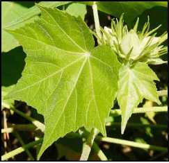 Description: Plant growing several metres high; young twig tomentose. Leaves alternate, long-petioled, palmatilobed, hairy on the lower side, margins toothed. Flowers large, simple or compound, solitary in the axil of the leaves, first white then pink. Capsule globose, covered with hairs. Seeds ovate and silky-villous.