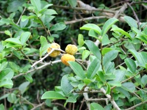 Description: Spreading shrub; bark grey, spotted with white. Stems and branches with incurved spines. Leaves alternate, shining green above. Flowers dioecious, pale-yellow; the male long-pedicelled in a short raceme, the female sessile in a dense axillary head. Fruit: a syncarp. All parts of the plant contain a milky juice.
