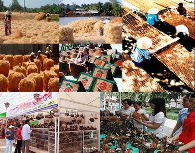 It is difficult to imagine the children's toys, dolls outside the car pulled even have someone pull the cart, pulled bike, a motorbike taxi, then Vespa, Jeep, containing a hidden meaning ... it is interesting the "Review of knowledge for life". Rub coconut (it is called the beard) is the product lanterns, flowers. Mo nan made flower boat. Bag coconut stems, flowers.